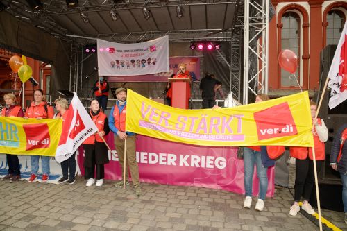 Hansi Weber von ver.di informierte über den mehr als berechtigten Streik bei den Sozial- und Erziehungsdiensten. „Wir sind keine Packesel“ hieß die Aktion der GEW um Ricarda Kaiser. Sie thematisierte die übergroße Belastung von Lehrkräften. Der engagierte neue DGB-Kreisvorsitzende Ralf Heller lotete im Gespräch mit dem zuständigen Gewerkschaftssekretär Angelo Bonelli die Bedeutung des Sozialtarifvertrags beim GKM aus.