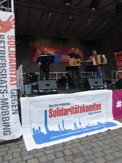 Die großartige Band ewo² (Bernd Köhler, Laurent Leroi und Joachim Romeis) umrahmte musikalisch die Kundgebung mit Arbeiterliedern und sorgte mit ihren politischen Songs für eine kämpferische Stimmung.